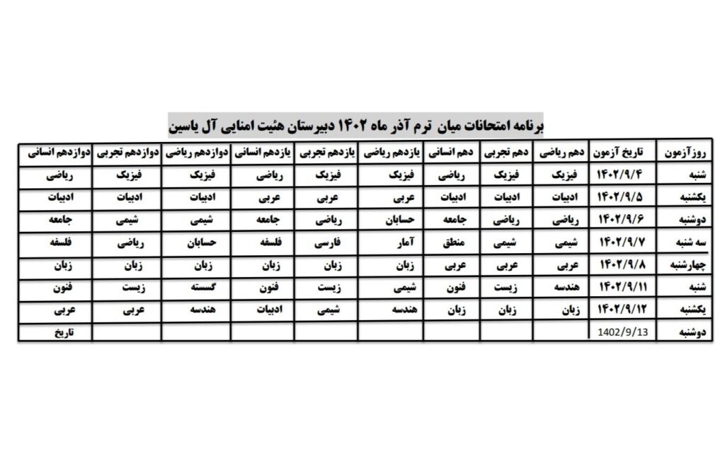 اطلاعیه شماره ۳ By مدیریت دبیرستانآذر 3, 1402آذر 2, 1402اطلاعیه کلیه پایه ها, دستهبندی نشده برنامه امتحانات میان ترم آذر ماه 1402